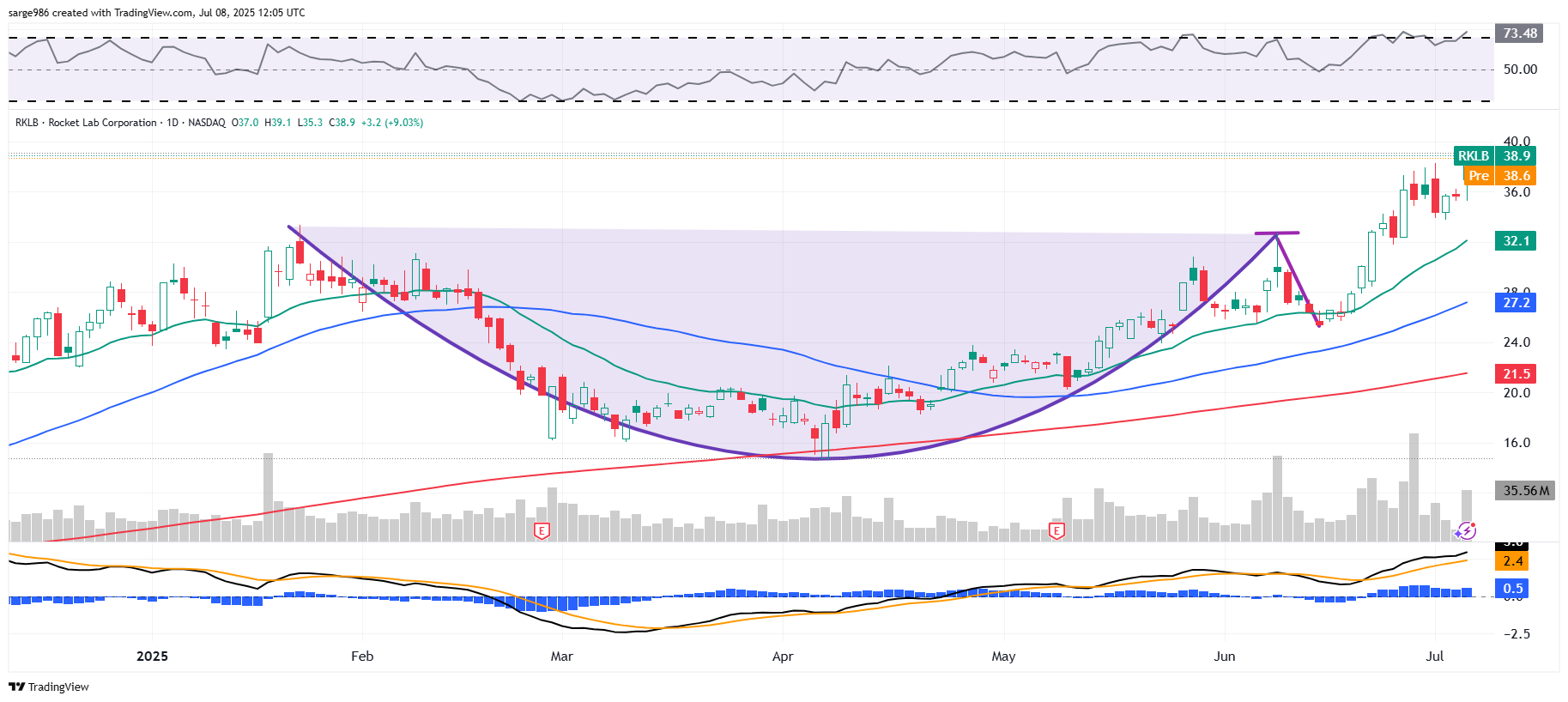 Shares of Rocket Lab soared 9.03% to $38.88 on Monday, creating all-time record high closing and intra-day highs for the stock. We took our target up to $42 from $39 in late June. Rocket Lab is sort of like Chevy to Cadillac when compared to SpaceX. The same Elon Musk story in regard to his taking his eyes off of his businesses in order to focus on politics that damaged Tesla TSLA shares on Monday probably also helped shares of Rocket Lab go higher. Looking at the options market for these shares on Monday, 162,000 contracts traded (well above normal) with a put/call ratio of just 0.34. ​