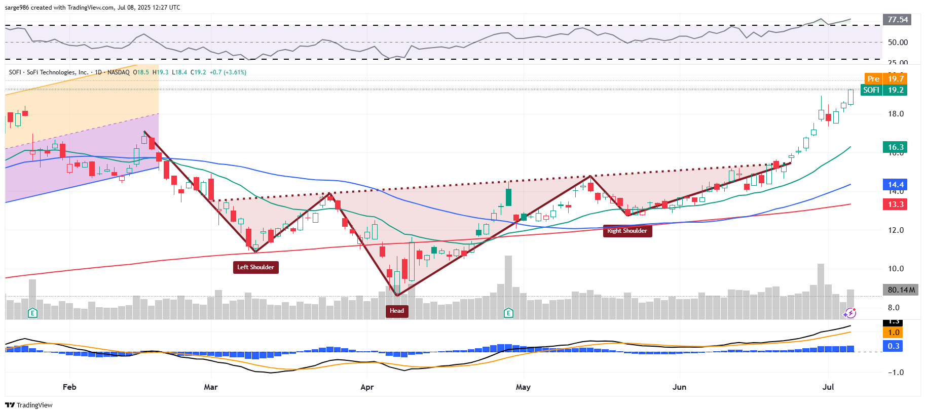 ​The stock continues to break out of inverted head-and-shoulders pattern of bullish reversal. On July 1, I increased our target price to $20 from $19.25. The stock actually apexed at $19.29 on Monday. Should the share price hit target on Tuesday, we know what to do. We take some kind of action, such as selling a small portion, therefore not failing to take a predetermined profit and then we see if we should lean in or take our target for the balance higher.
