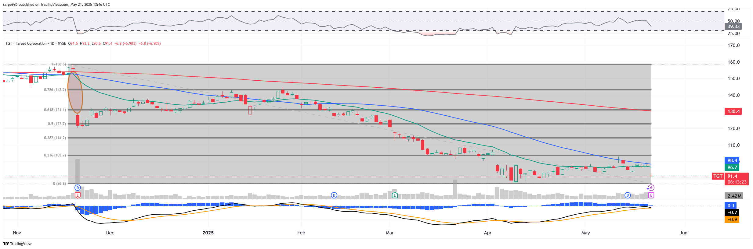 Readers will see that earlier this May, TGT was rejected very close to its 23.6% Fibonacci retracement level of the November through early April sell-off. Let's get rid of the Fib-model so I can show you something else.