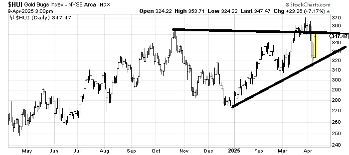I don’t feel like I have a great read on HUI, the AMEX Gold Bugs Index, because it did not break down, so the trend is still up, but it has that resistance at 360 that will be tough to overcome. If it can clear that recent high then we’d be looking at an eventual target in the mid 400s. I’m just not sure it’s ready to fly.