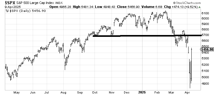 The levels get fairly wide now. 5500 is where we gapped down under last Thursday, so that is probably short-term resistance on the S&P. But I have my eye on that 5600-5700 area. That would fill the gap and run smack into where the top broke down from.