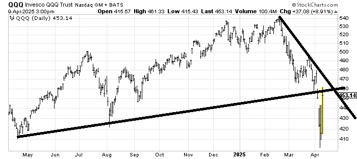 I drew in this lower line on the QQQs QQQ on Monday, and it’s still relevant as the first resistance area. I think the QQQs ought to fill that gap up near 470, though as the next target.