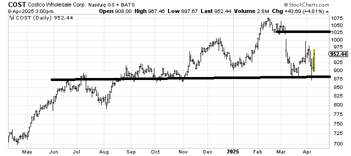 Costco COST is worth watching because it held up so well. If it fails at 1000, I would get very concerned that the chart is vulnerable in the next downturn.