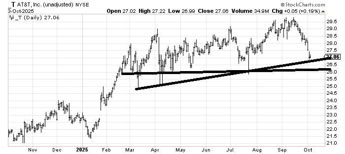 AT&T (T) has had quite a correction in the last few weeks. But it has plenty of support in the 26-27 area so I would expect it is getting oversold and should find some footing in this area.