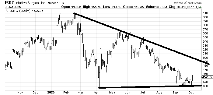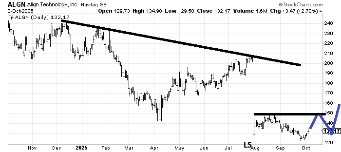 Is it possible that Align (ALGN) is forming a head and shoulders bottom with the left shoulder in August and the head the low in September? Time will tell. First, it ought to rally into that 150-ish area and then (maybe on tax loss selling?) come down into year-end to form the right shoulder. That might be getting ahead of myself, so let’s just start with a rally to that resistance.
