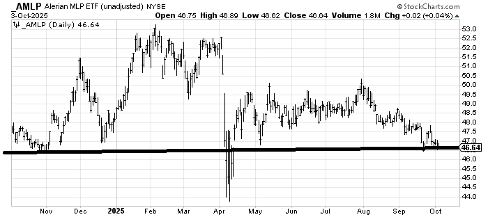 I would like to like (AMLP) an ETF to be long MLPs, but gosh, it is so droopy, with so little life. Yet this 46-ish area seems to have some decent support. Perhaps if it goes sideways for a while longer, I can warm up to it.