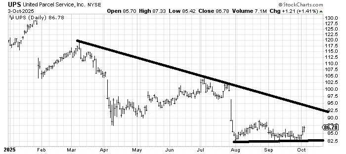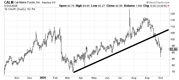 Cal-Maine (CALM) has a strong tendency to trade very spiky—notice the high in July or all the peaks late last year and early this year. That recent low looks like a cleanout. Not shown on the chart is a big spike in volume on that low near 86. I would guess it starts to settle down and attempt a rally in the next few weeks. The chart itself doesn’t look great to me, but if you want to trade it, I would lean to the upside after that whoosh last week.