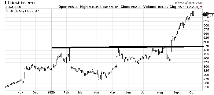 Ubiquiti (UI) is almost like a chart out of a textbook, having broken out of a long base on a gap and kept on going. But now it has reached its measured target, so I would be in favor of taking some profits here. It’s difficult to say there is support at any level because it hasn’t had much of a rest along the way. I would have to see a pattern shape up to say much more.