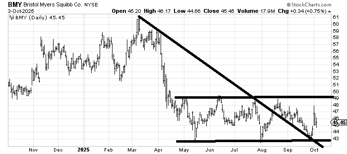 Bristol Myers (BMY) couldn’t even get over 49 on last week’s rush to cover shorts in drug stocks (yes, I believe a lot of the drug stock action was shorts rushing to cover). But it still looks like it’s basing to me. My patience is wearing thin, but that’s how it looks to me.