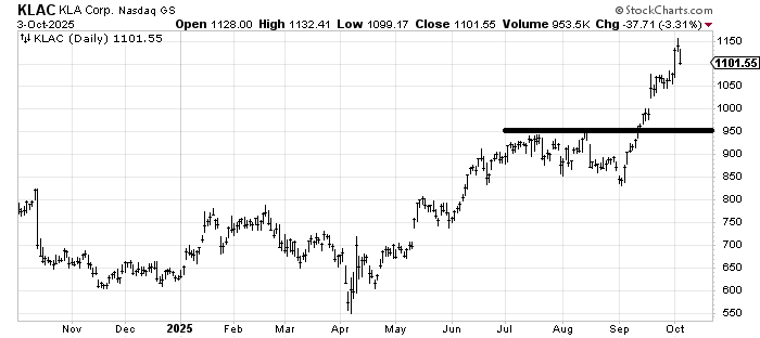 KLA (KLAC) hasn’t done anything wrong except get overextended, so it is in need of a correction. Coming down into that 950-1000 area would be great because it would test the breakout and fill that gap (at 1000), but if KLAC is coming down that much (10%+), then chances are the major indexes are finally going to correct.