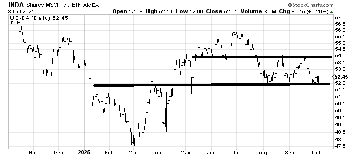 There is someone out there who used to ask about Indian ETFs, so I thought I would note that they have had quite a correction since July, but in the last two months, INDA has refused to break 52. I leave the possibility that there might be one more push down, but INDA is starting to get interesting again. I don’t want to see it much below 51, so the risk/reward is decent if you have some patience.