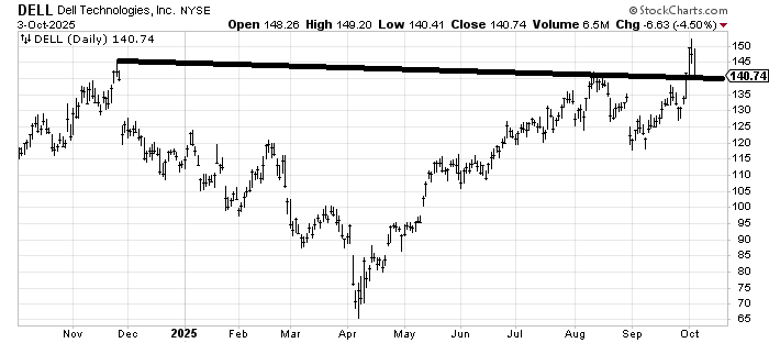 Dell Technologies (DELL) , which I think I didn’t like at 120, so perhaps you want to fade me on my views here, should try and hold here if it is going to be any good. If it comes down much more than this (call it under 135), this is going to look like a false breakout.