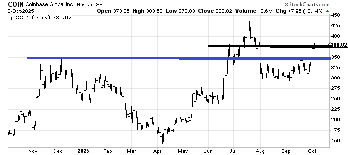 As a follow-up, Coinbase (COIN) , which I recommended in late August/early September, has finally filled that gap. If you are just trading it, you might want to take a little off. There is decent support back around 350-ish.