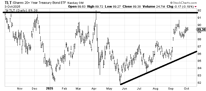 Finally, last week I thought (TLT) could lift to fill that gap near 89, this week I would remind you that I still do not think it is poised to breakout over 92, and now that the gap has been filled could easily come back down. Bonds remain in a trading range for now.