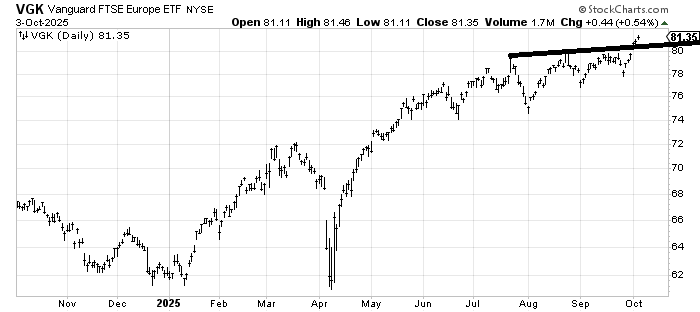 Another thing that occurred last week was (VGK) , which you may recall I first liked around Thanksgiving last year and had a target in the low 80s, finally got going again after nearly three months of sideways. The target is still somewhere in the 82-85 area. I just don’t want to see it back under 80 now.
