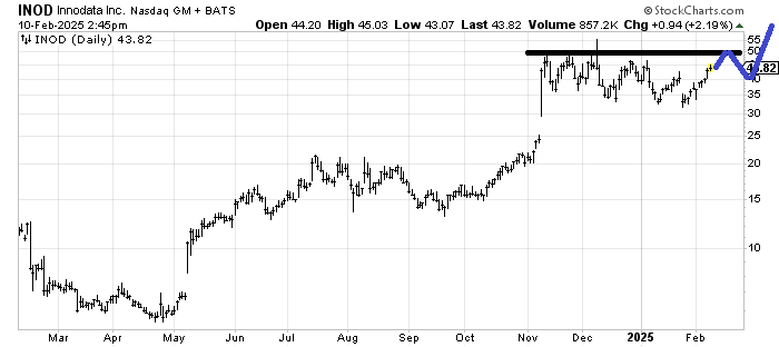 I would love to see the pattern in Innodata INOD map out something akin to the way I have drawn in blue. Pay more attention to the pattern than the exact price.