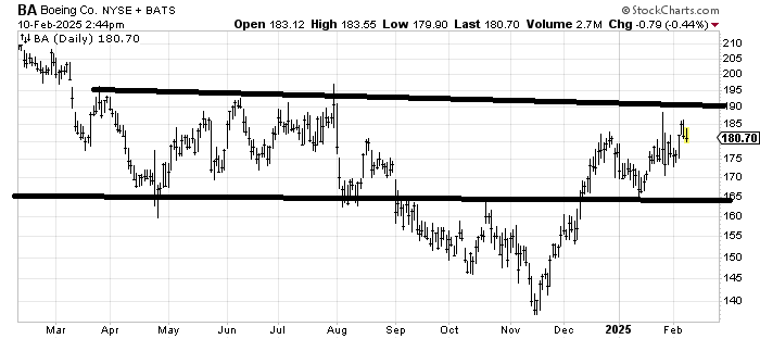 I have liked Boeing BA for a few months now as a bottom fish in a stock everyone hated. I think it should struggle up here at resistance but ultimately ought to break out over 190. The support is all the way back at 165, which feels too far away to use as a stop right now. It would be great if the stock just meandered around 180 for a while because that would give it some oomph to rally again.