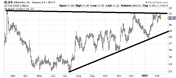 Alkermes ALKS has gone nowhere for years, so a move up and over this 32 area would be great and positive for the stock. It would be even better if it could do it without trading back under 30.