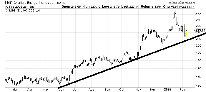 Cheniere Energy LNG is a stock in an uptrend so as long as it doesn’t break 210 (the uptrend line) you buy dips near the trend line with a stop under it.
