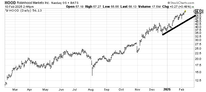 Robinhood HOOD is over-extended, but that’s the worst thing I can say about it. It would have to make a lower high and a lower low to do anything wrong.