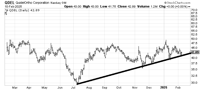 Just a reminder that Quidel Ortho QDEL has pulled back to the line that has held for a few months now and the chart has a base. That makes the risk/reward decent again.
