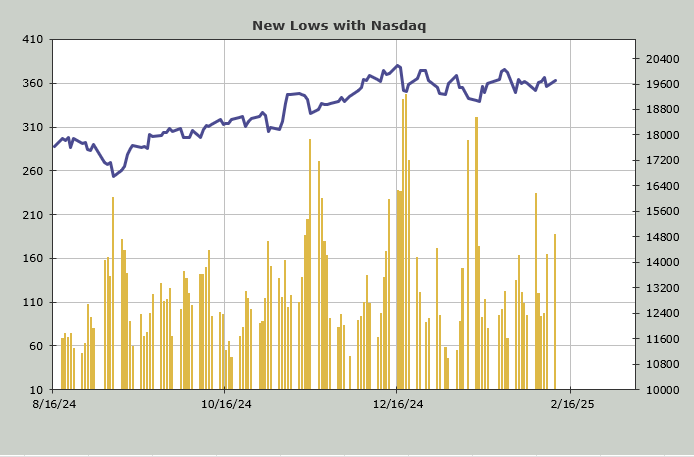Finally, there is the fact that on an up day, the number of stocks making new lows has climbed. Recall last week, I said I wanted to see how this indicator acted on an up day. Now we have our answer: folks were selling.