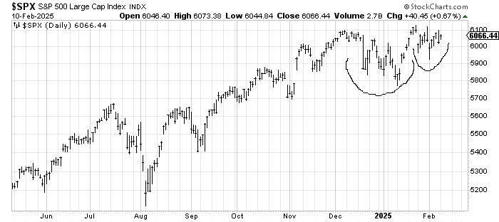 For six of the last ten trading days, breadth has been negative (there’s your chop) which means the market is a tiny bit oversold. Another point would be that the McClellan Summation Index is still rising. Then if we were just looking at the S&P and searching for a pattern, we might even say there is a cup and handle developing. That’s my big positive list. I know it’s not much but that’s what I’ve got.