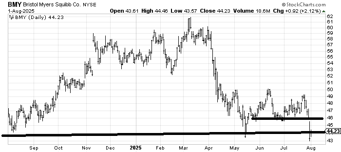 I did not expect Bristol-Myers Squibb BMY could have more sellers in it but it managed to break $46 rather handily last week. It’s now oversold enough to rally. Was Thursday a test of the May low (my view: spike lows tend to hold the first trip down) or just a way station? If the stock can get back over $46, it is the former, if it cannot, it is the latter.