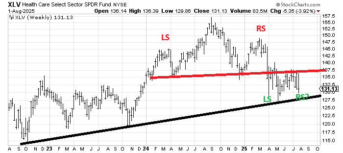 I was asked about the potential head-and-shoulders bottom on the daily chart of the Health Care Select Sector SPDR Fund XLV (green). But I was also asked about the potential head-and-shoulders top on the chart of XLV (red).