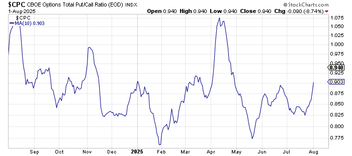The last two days the equity put/call ratio starting climbing, with Thursday’s reading at 0.84 and Friday's at 0.75. But let’s look at the 10 DMA of the total put/call ratio. It’s finally on the move upward, now clocking in around 0.90. Generally speaking once it gets over 0.95 it tells me there has been a sentiment shift and folks have gotten cautious.