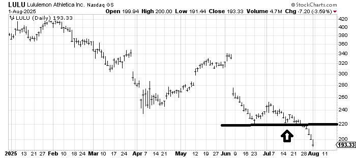 Lululemon LULU has been in a downtrend for more than a year, but you can see the acceleration that took it down starting in early July. I thought it would bounce when it got to that arrow but you can see the bounce was rather pathetic and now it has broken. Last week’s slide has probably taken the stock to an oversold condition. If you want to play for a oversold bounce I would expect one to show up this week. But right now that’s the best I can see here.