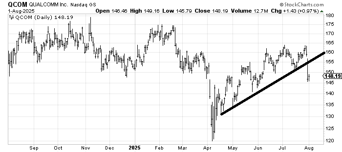 When you look at the chart of Qualcomm QCOM you’d never know it was a semiconductor stock; it looks more like a drug stock. It’s got support levels all the way down but if it rallies back near $155 in the near term I think I’d be inclined to sell it.