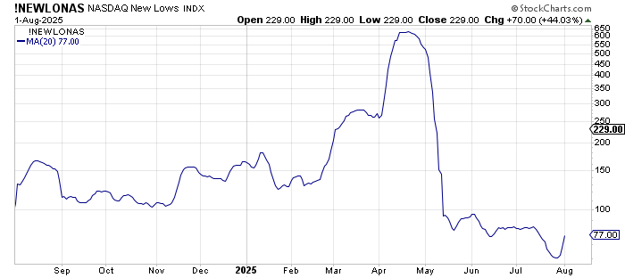 Recently, I showed you how the 10-day moving average of stocks making new lows had turned up but not yet the 20-day moving average. Now the 20 DMA has joined it. Friday saw nearly 100 stocks making new lows on the NYSE (over 200 on the Nasdaq), the most since April. That raw data needs to contract before the moving average can peak.