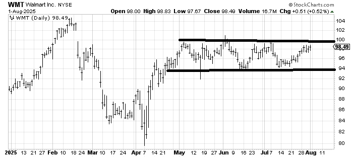 Since May I have been of the mind that Walmart WMT was in a trading range between $94-100. Shockingly, that is exactly what it has done. In the last few weeks WMT has seen no selling. If WMT holds over $97 it could break out over $100 when we get oversold again. Under $97 and the range continues.