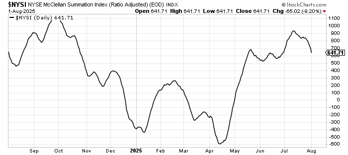 Then there is what it will take to turn the McClellan Summation Index from the current down to halting the decline. Again, on this chart of the Summation Index you can see the decline didn’t just start last week but began in early July. It currently needs a net differential of +3,300 advancers minus decliners on the NYSE to halt the decline. That makes it moderately oversold; at +4,000 we’re oversold. Thus, if the selling continues into midweek it ought to get to +4,000 or more.