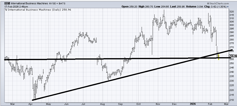I really thought that IBM (IBM) was going to hold that 290-300 area after having spent so much time digesting the move. But instead, it gave way and has barely managed to hold on. It’s still too early to say it will hold 255-ish but if it can rally from there then I think the best it can do is 270-280.