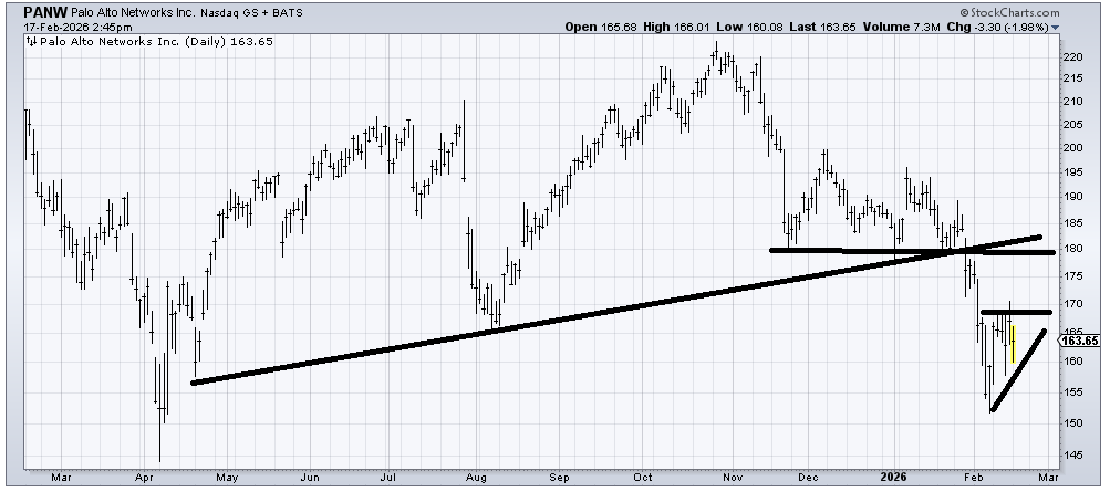 Palo Alto Networks (PANW) is trying to hold after the recent collapse. Let me say right now, and this is true of all these software stocks that have collapsed: they should stabilize and rally. If they merely stabilize but do not rally, then I would expect the next trade to be down, not up.
