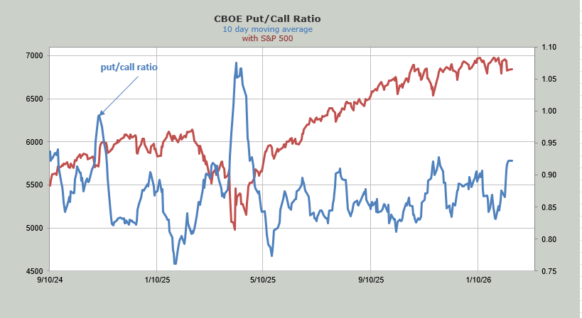 The ten-day moving average of the CBOE put/call ratio is now .93. This too is in the same place it was in November, near the low, although you can see it is nowhere near the panic level we saw last April.