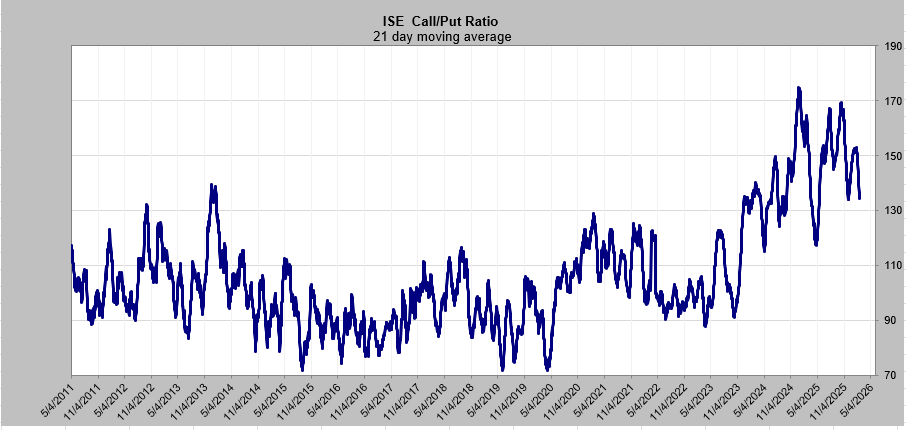 When we use the ISE Equity call/put ratio and put that on a ten-day moving average, we see it is now the lowest since the April lows. Oh, it has quite a bit to fall until it gets there (current reading is 1.8, and the April low was 1.55). But again, you can see that November low on the chart, and this one is lower.
