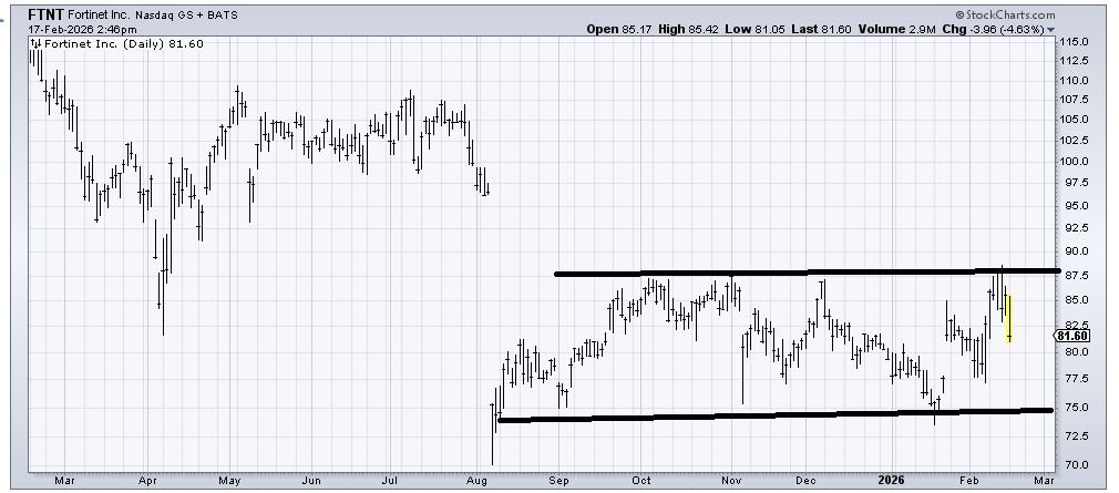 Fortinet (FTNT) is a terrific chart for instruction. It had the big gap down in August and has spent these last six months trying to steady itself and find its footing. I think if it comes back into that mid-70s area it should hold. If it cannot get all the way back to 77 on this trip down, then it gives it a better chance of breaking out on the upside on the next trip up.