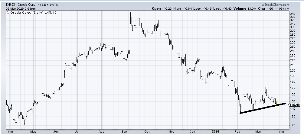 Oracle (ORCL) is getting a little oversold and has support in this 140-145 area, so I’d expect a bounce, but that’s it. There is no base, and support is tentative. This is just short-term stuff as best I can tell right now.