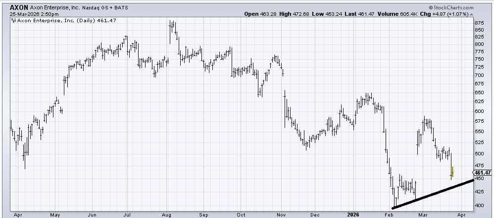 Axon Enterprise (AXON) has filled the gap from February and has support at the line (around 440), so it ought to bounce, but this is not a good chart in my view. There is no base to speak of. If it is still sitting in this area a few weeks from now, maybe it shapes up better, but right now just a short-term rally.
