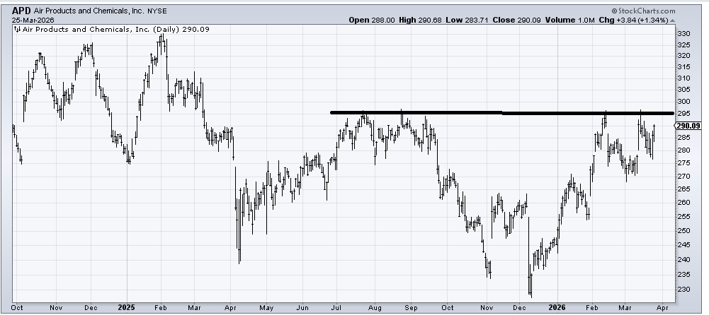 We’ve looked at several of the chemical stocks lately with positive eyes (LYB and DOW come to mind). To that, I would add Air Products (APD) if it can get over this 295 area; it would be impressive.