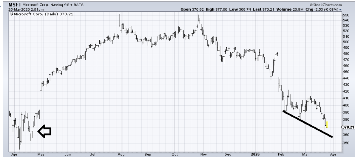 If Microsoft (MSFT) can get down to that 360-65 area, I’d be okay with buying it for a trade because it would be bouncing off that line, and there is a small measured target that shows up around there. And it is getting grossly oversold. It would even fill that tiny little gap from last April.
