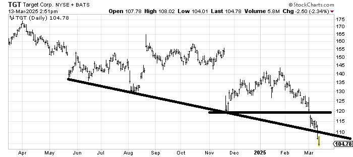 Target TGT has fallen out of support on two fronts: the flat line and the slanted one. That flat line pattern measures to around 100 but as I said the last time we looked at it a few weeks ago, bottom fishing in it hasn’t paid.