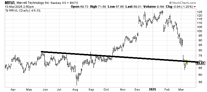 I would have expected Marvel MRVL to rally from that 70 area, but like so many stocks, it has not even taken a breather at support. Here, too we should see a bounce. A gap fill might be tough in this market, but 75 on any oversold rally should be doable.