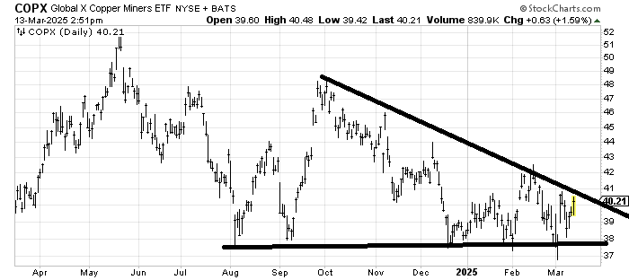 COPX is an ETF for copper miners, and it really needs to get over 41. I had mapped out a path that I thought FCX (in the ETF and a very similar pattern) ought to take, and while it has varied somewhat, that’s the path it is taking. If it cannot get over 41 in the next 2-3 days, it’s a problem, but mostly it still feels as if it is early but trying to bottom.