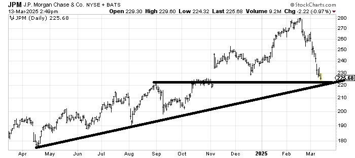I have not been a fan of the banks for a while now, but I did think Goldman Sachs GS could rally earlier in the week (it has not done so). And now I am asked about JP Morgan JPM which also looks terrible but has a decent amount of support in this 220-225 area and a gap fill. It ought to bounce. I’d sell a bounce to 240 if it got there.