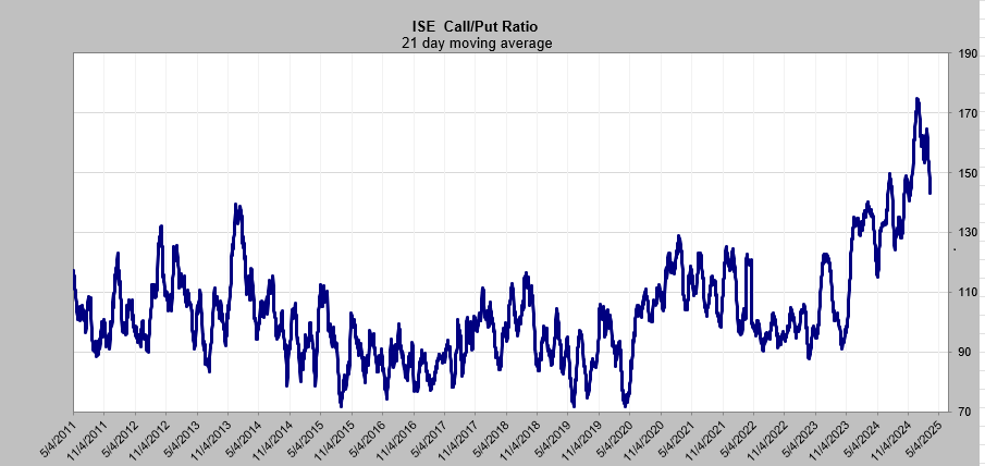 The ISE call/put ratio’s 21-DMA has come down. Oh, not enough to call it bullish, but it, too, is heading in the right direction. You can really see the call buying has slowed.