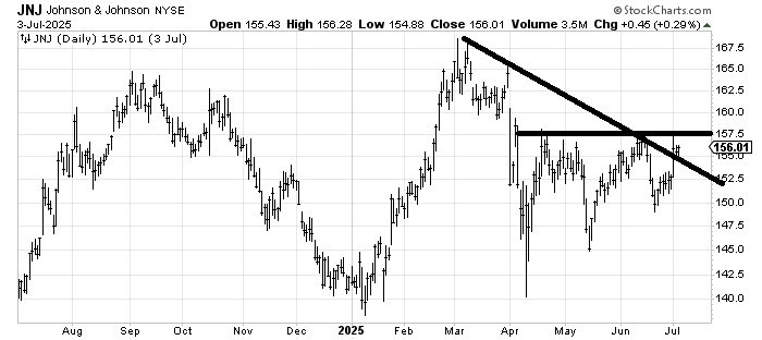 Johnson & Johnson JNJ has not been one of the drug stocks I have liked in this recent move up for them. But the chart is now very interesting to me because it crossed that downtrend line and is knocking on the door of that flat resistance line. It’s probably worth a shot.